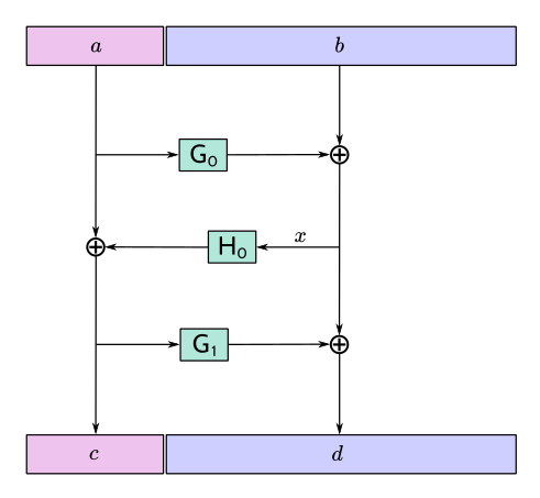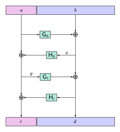 The inverse function \(\mathsf{F4Jumble}^{-1}\) is obtained in the usual way for a Feistel construction, by observing that \(r = p \oplus q\) implies \(p = r \oplus q.\)